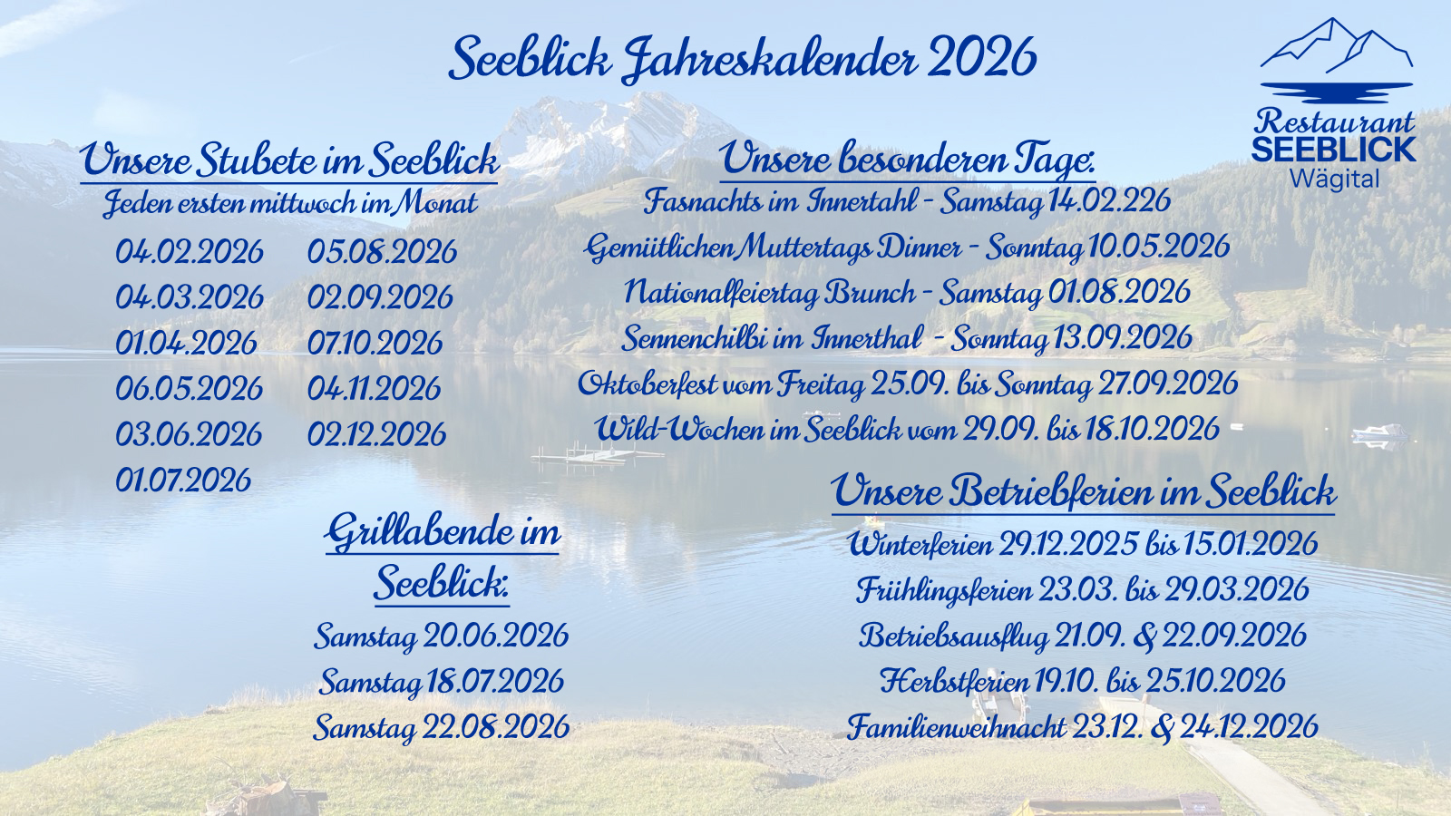 Damit mir gnueg Platz hend und alli es Plätzli finde, dürfed ihr eus gärn e Mail schriebe, wenn ihr derbi sind: restaurant@seeblickwaegital.ch
