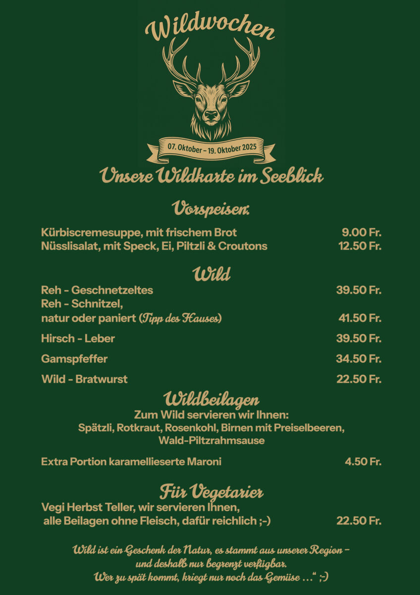 Wenn’s draussen langsam kühler wird, die Bäume sich färben und der See stiller wird, beginnt bei uns im Seeblick eine der schönsten Zeiten des Jahres – die Wildwochen.