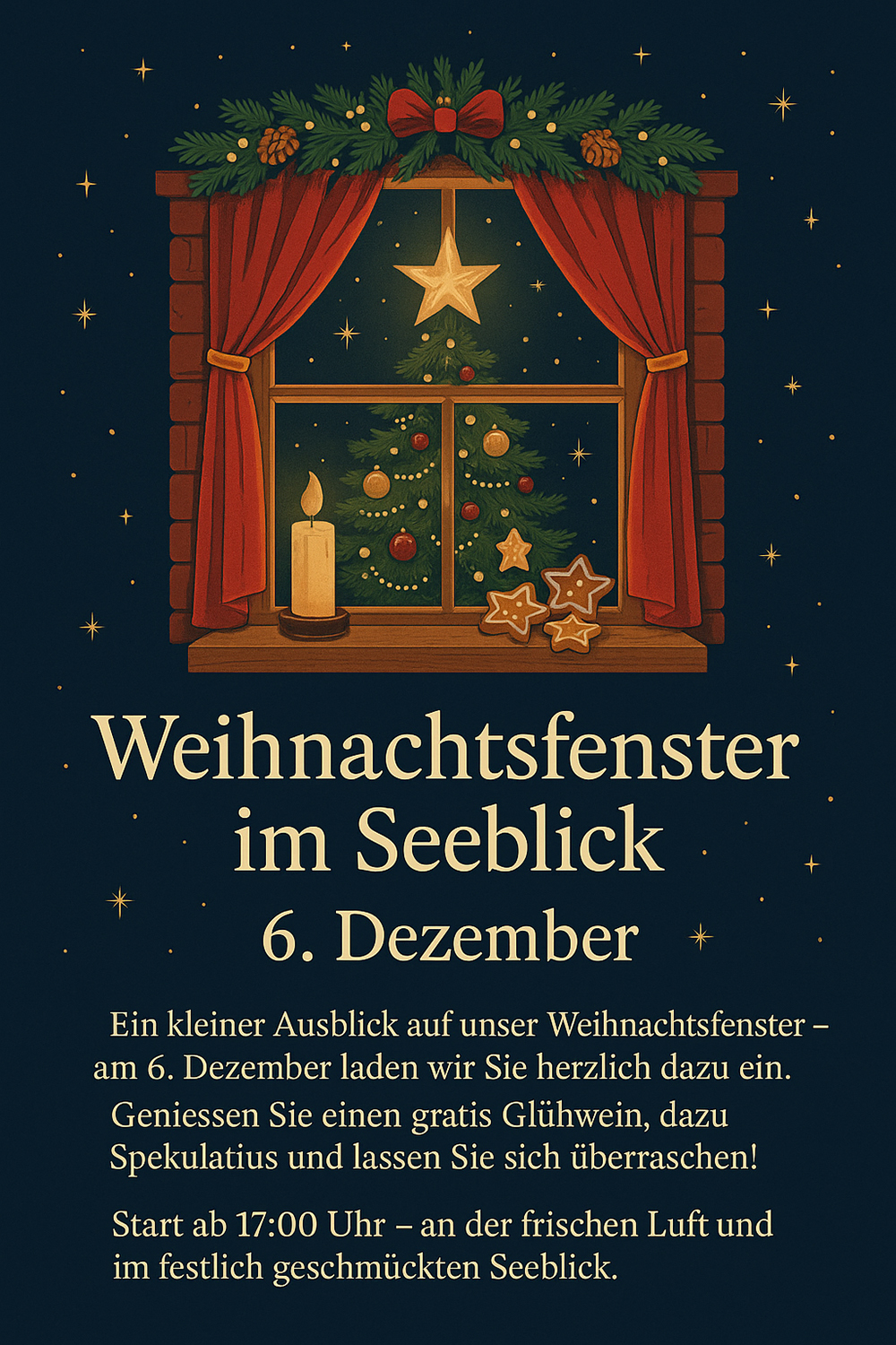 Ab 17:00 Uhr laden wir Sie herzlich ein, unser Weihnachtsfenster bei einem Gratis-Glühwein und feinen Spekulatiuszu bestaunen. Ein stimmungsvoller Moment an der frischen Luft – direkt vor dem festlich geschmückten Restaurant Seeblick.