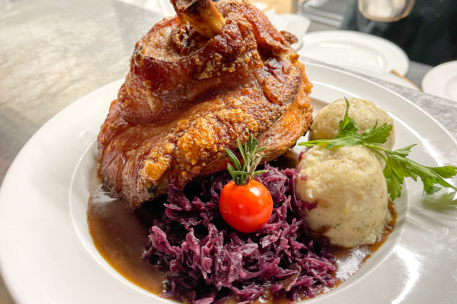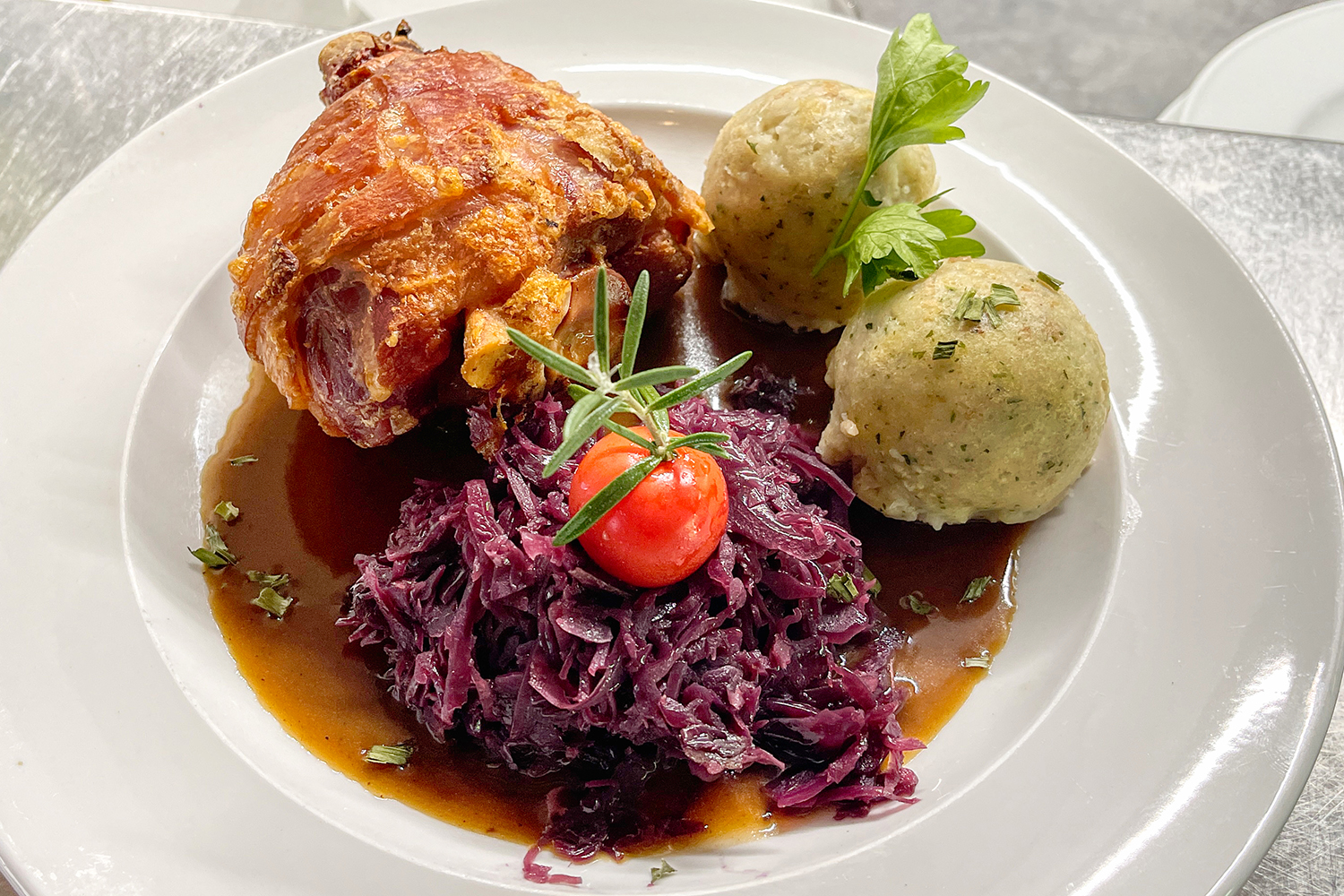 - kleine Schweinshaxen mit Semmelknödel und Rotkraut